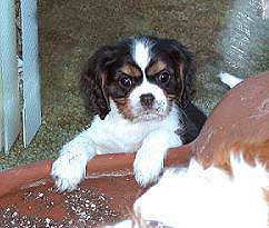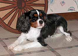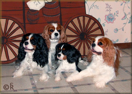 The girls in front of the 'covered wagon' that I made for the Cavalier club's benching decoration at the 2003 Portland Kennel Club's show. (Sadly I think that was the last benched show for Portland Kennel Club, many fun hours were spent socializing with friends and answering inquiries from visitors at the benched shows...) |