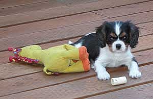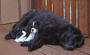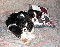 ![]() Phoebe and Kalo enjoy each other's company, but with the pillow it looks as though there are three puppies there! |