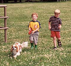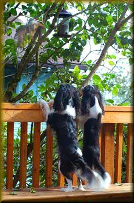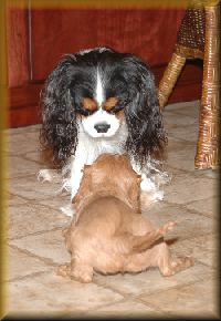 Cavaliers are very sweet, never bitchy or witchy, so they get along very well with other family pets. However, they still consider themselves to be 'sporting' dogs, and will guard the deck and yard while on "squirrel patrol".