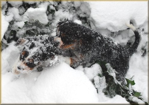 JoJo, Birdie and a couple of puppies check out the strange white cold stuff!