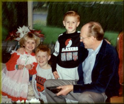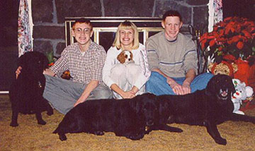 | One of my favorite photos of the children and the dogs, taken before Christmas of '99. In the back are Kyle, Brittany holding baby Tilly, and Colin. The Labs are Kippy, Jessica, and Tuxedo (may the dogs all RIP). |