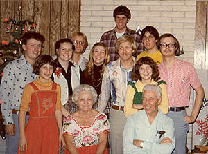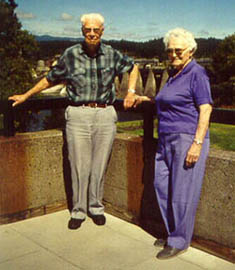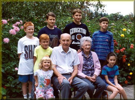 | The photo on the left is of my grandparents, my mother's parents, when they were 92 years young, on an outing to Bonneville Dam. Grandpa retired from Bonneville Power Admin. after 33+ years, wow! Grandma was an excellent seamstress - she made my entire bridal trousseau! Please go to Grandma Audrey's page to learn about her wonderful life. And one of these days I will make a webpage for Grandpa using the materials and photos from his book! On the right is a photo taken in the late 70's of my grandparents with their great grandchildren - plus two spouses! |